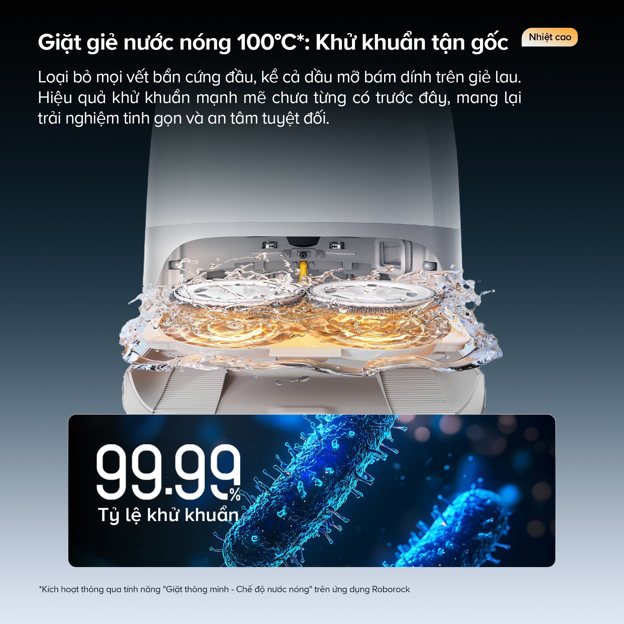 Điểm nhấn về mặt công nghệ đột phá trên Roborock Qrevo Curv 2 Pro chính là hệ thống làm sạch toàn diện Heat³ – Đây là chu trình giặt, lau và sấy khép kín bằng nhiệt độ cao mang đến khả năng làm sạch sâu và diệt khuẩn tối ưu nhất. Ở bước đầu tiên, khăn lau của Roborock Qrevo Curv 2 Pro được giặt bằng nước sôi 100°C, giúp loại bỏ hoàn toàn bụi bẩn, vi khuẩn và cặn bám. Tiếp đó, sàn nhà được lau bằng nước nóng 60°C, kết hợp lực ép 12N mạnh mẽ, dễ dàng xử lý các vết bẩn cứng đầu như dầu mỡ, cà phê, sữa hay nước sốt.