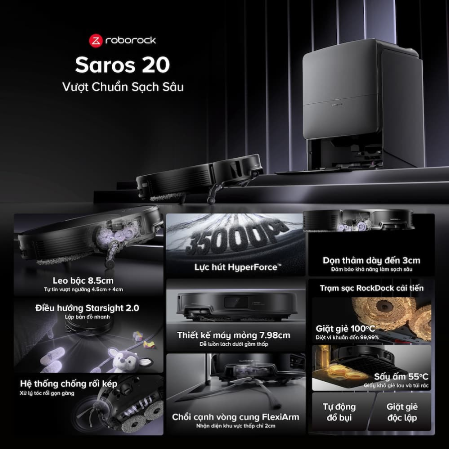 Không chỉ dừng lại tại đó, Roborock Saros 20 còn sở hữu công nghệ điều hướng StarSight 2.0 kết hợp cảm biến 3D và VertiBeam giúp robot nhận diện vật cản nhanh chóng mà vẫn đảm bảo chính xác, đồng thời, di chuyển thông minh và lau sát mép tường tối ưu hơn. Cuối cùng, Roborock Saros 20 cùng với trạm sạc đa năng có thể tự động giặt giẻ bằng nước nóng, làm sạch sâu và sấy khô, đảm bảo vệ sinh tuyệt đối, tiết kiệm thời gian và nâng tầm trải nghiệm dọn dẹp mỗi ngày.